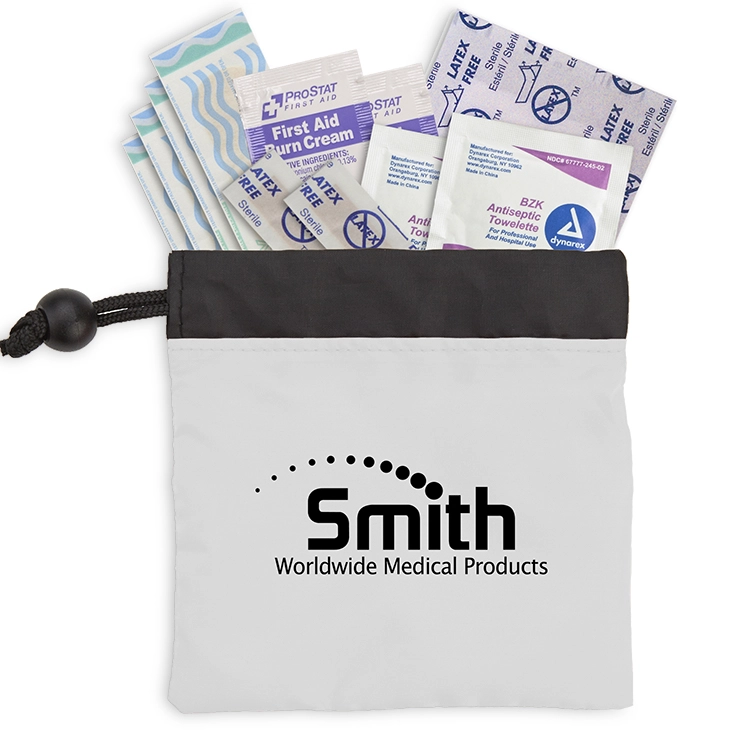 The 11 Piece Cinch Up First Aid Kit is a convenient and compact first aid kit. Comes in a 190T nylon cinch up pouch with a push-button adjustable cord clasp, this kit is easily accesible and can fit most purses, medicine cabinets, and drawers. It includes 4 latex-free bandages, 2 snip bandages, 2 antiseptic towelettes, 2 first aid cream packets and a 2" x 3" adhesive pad. Whether for healthcare campaigns, survival, or emergency conventions, this kit is a practical and thoughtful giveaway that promotes safety and preparedness in any situation.