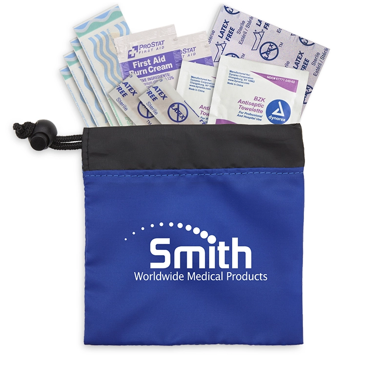 The 11 Piece Cinch Up First Aid Kit is a convenient and compact first aid kit. Comes in a 190T nylon cinch up pouch with a push-button adjustable cord clasp, this kit is easily accesible and can fit most purses, medicine cabinets, and drawers. It includes 4 latex-free bandages, 2 snip bandages, 2 antiseptic towelettes, 2 first aid cream packets and a 2" x 3" adhesive pad. Whether for healthcare campaigns, survival, or emergency conventions, this kit is a practical and thoughtful giveaway that promotes safety and preparedness in any situation.