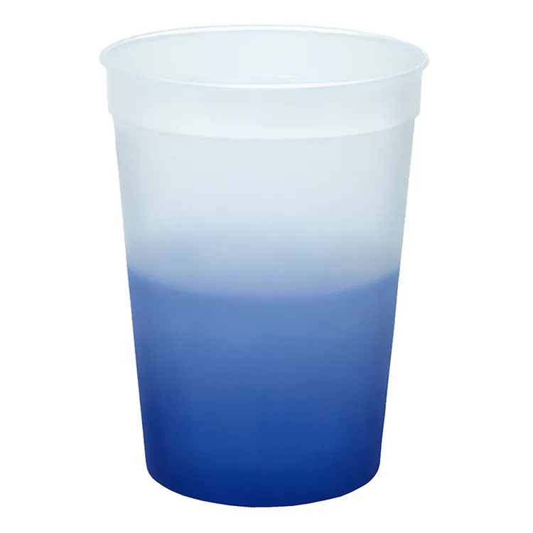 This mood color changing stadium cup is made out of plastic material that is BPA-free. It can hold up to 12 oz. of liquid and the cup changes colors when exposed to ice cold liquids. Changes from frosted to blue. Available in 10 different color changing colors.