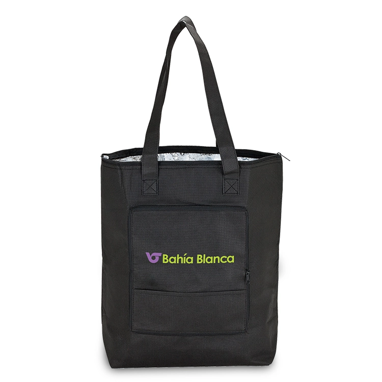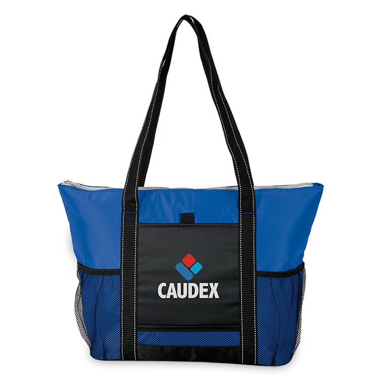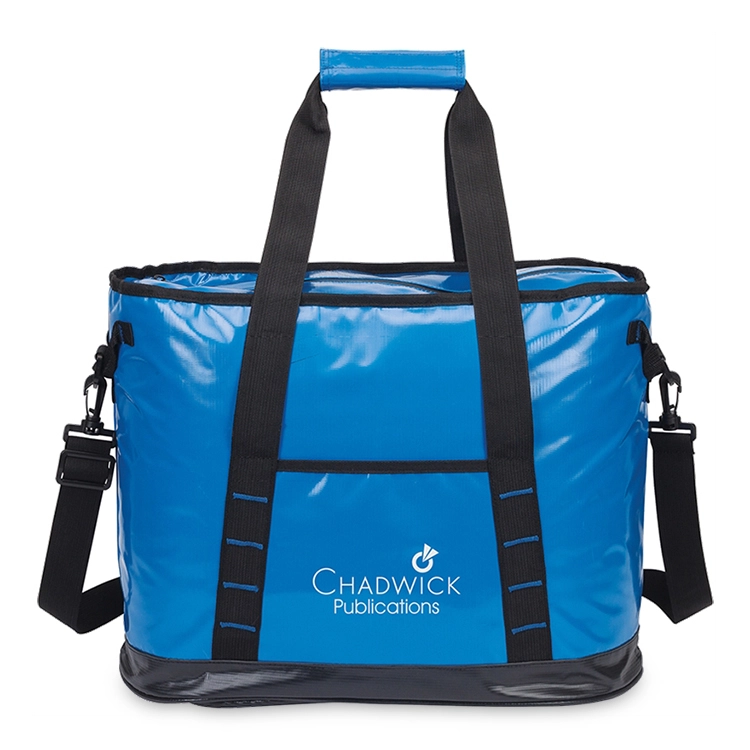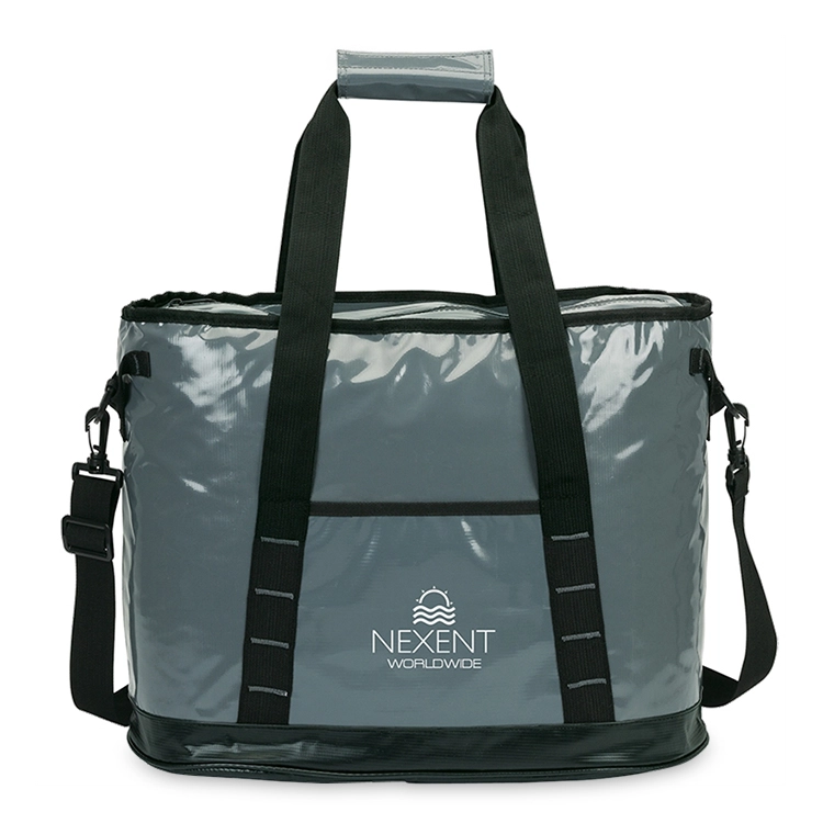 The Adjustable Water-Resistant Cooler Tote Bag - 24 Can with heat-sealed PEVA-insulated lining holds up to 24 cans and features a water-resistant exterior and zippered main compartment. It has a front pocket 2 handles with hook and loop grip 2 side carry handles for easy maneuvering and a removable and adjustable 1 1/2" x 47" padded shoulder strap with swivel clips.
