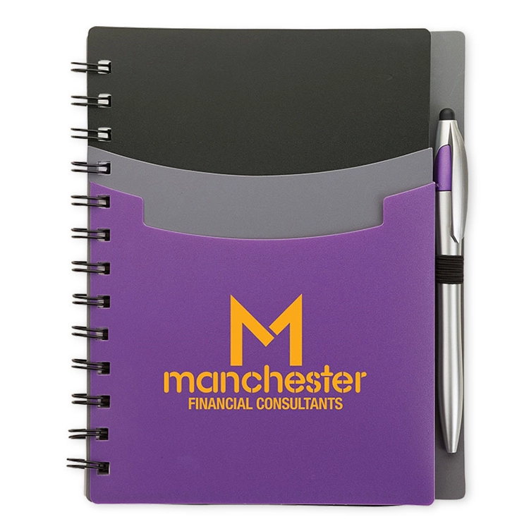 This tri-tone notebook blends function with style, featuring a durable polypropylene cover, 80 lined pages, and smart pocket storage. Two exterior and one interior pocket keep essentials close, while the included twist-action pen doubles as a stylus for touchscreen devices. Designed for on-the-go organization and multitasking.