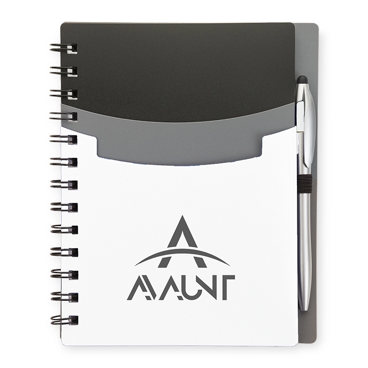 This tri-tone notebook blends function with style, featuring a durable polypropylene cover, 80 lined pages, and smart pocket storage. Two exterior and one interior pocket keep essentials close, while the included twist-action pen doubles as a stylus for touchscreen devices. Designed for on-the-go organization and multitasking.