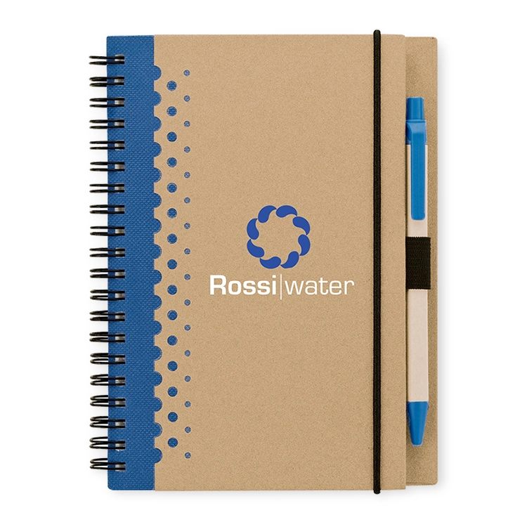This junior-size hard-cover notebook delivers convenience with eco-inspired touches. It features 80 lined pages, spiral binding, and a secure elastic closure. A paper barrel plunge-action pen is included and stored neatly in the integrated pen loop. Ideal for meetings or mobile use, it combines functionality with a compact profile.