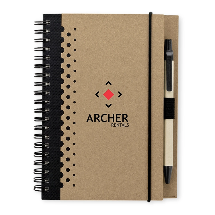 This junior-size hard-cover notebook delivers convenience with eco-inspired touches. It features 80 lined pages, spiral binding, and a secure elastic closure. A paper barrel plunge-action pen is included and stored neatly in the integrated pen loop. Ideal for meetings or mobile use, it combines functionality with a compact profile.