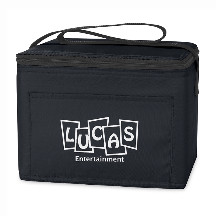 The Budget Cooler Bag with PEVA Lining - 6 Can is made of 210D Polyester. It has a zippered main compartment and a front pocket for extra convenience. It includes a 20” web carrying handle. Spot clean only and air dry.