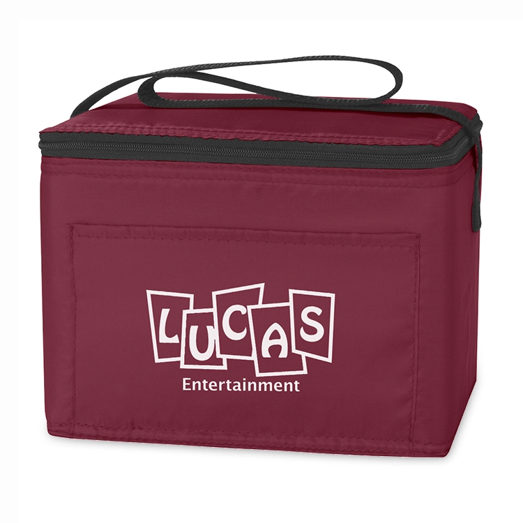 The Budget Cooler Bag with PEVA Lining - 6 Can is made of 210D Polyester. It has a zippered main compartment and a front pocket for extra convenience. It includes a 20” web carrying handle. Spot clean only and air dry.