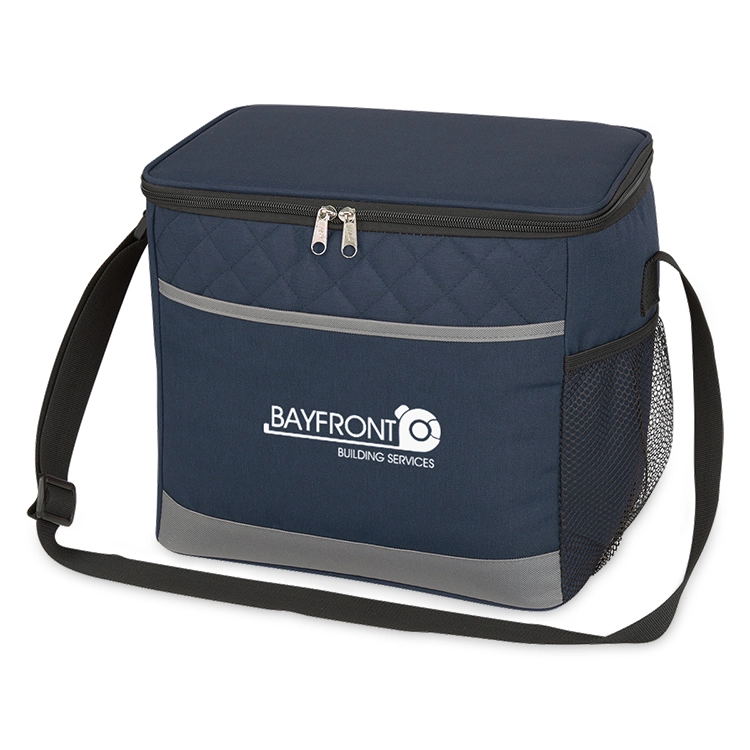 The Carter Quilted Cooler Bag - 12" x 10.5" combines style and functionality, making it the perfect accessory for your next party or picnic. Crafted from a durable blend of 300D and 600D polyester with a PEVA lining, it ensures your food and drinks stay cool and fresh. The double zippered main compartment and side mesh pocket provide ample space, while the large front pocket with hook and loop closure offers additional storage. Featuring an adjustable shoulder strap for easy carrying, this cooler bag is also easy to maintain with spot cleaning and air drying.
