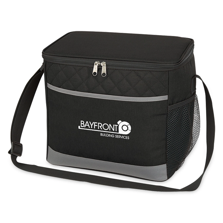 The Carter Quilted Cooler Bag - 12" x 10.5" combines style and functionality, making it the perfect accessory for your next party or picnic. Crafted from a durable blend of 300D and 600D polyester with a PEVA lining, it ensures your food and drinks stay cool and fresh. The double zippered main compartment and side mesh pocket provide ample space, while the large front pocket with hook and loop closure offers additional storage. Featuring an adjustable shoulder strap for easy carrying, this cooler bag is also easy to maintain with spot cleaning and air drying.