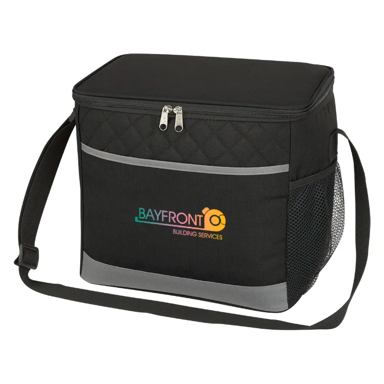 The Carter Quilted Cooler Bag - 12" x 10.5" combines style and functionality, making it the perfect accessory for your next party or picnic. Crafted from a durable blend of 300D and 600D polyester with a PEVA lining, it ensures your food and drinks stay cool and fresh. The double zippered main compartment and side mesh pocket provide ample space, while the large front pocket with hook and loop closure offers additional storage. Featuring an adjustable shoulder strap for easy carrying, this cooler bag is also easy to maintain with spot cleaning and air drying.