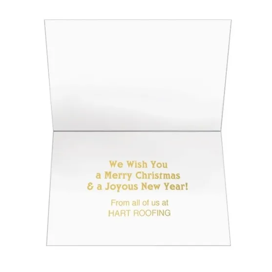 Your clients' cold and breezy holidays will be warmed up when they receive the Comfort & Joy Snow Hills Holiday Card. It features printed frolicking reindeer amidst gently falling snow that will evoke warm Christmas-time memories. Inside is a pre-designed sentiment, "We Wish You a Merry Christmas & a Joyous New Year!" and your foil stamped logo under, it also comes with a gold foil-lined envelope. Custom sentiments are available; please inquire for options and pricing. White envelopes with inner foil accents are included, but the card is scored and shipped flat and not inserted into the envelope