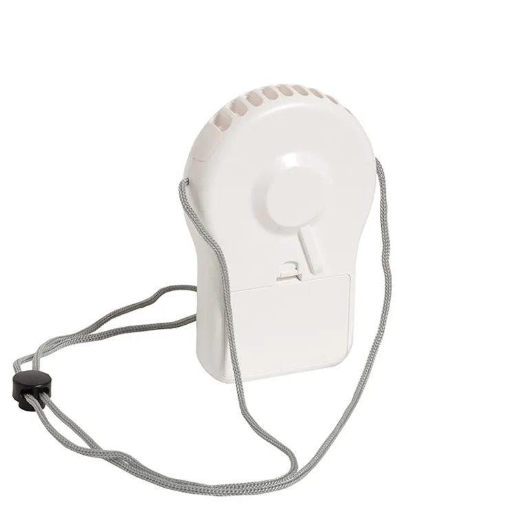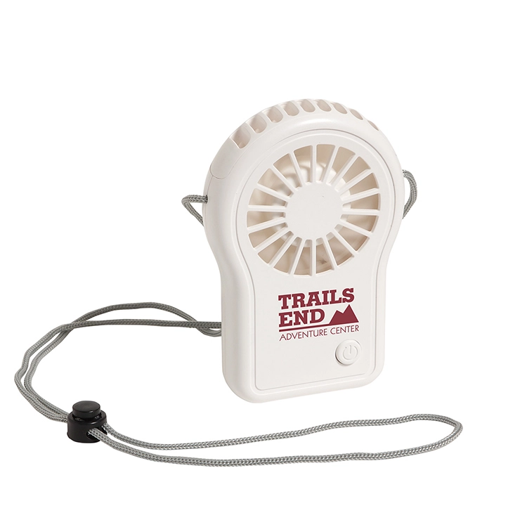 This portable fan combines a lightweight ABS plastic body with an adjustable lanyard for hands-free convenience. It features a single fan speed controlled by a front button and is powered by three included AAA batteries. Each unit is boxed in FSC-certified packaging and includes instructions for quick setup.