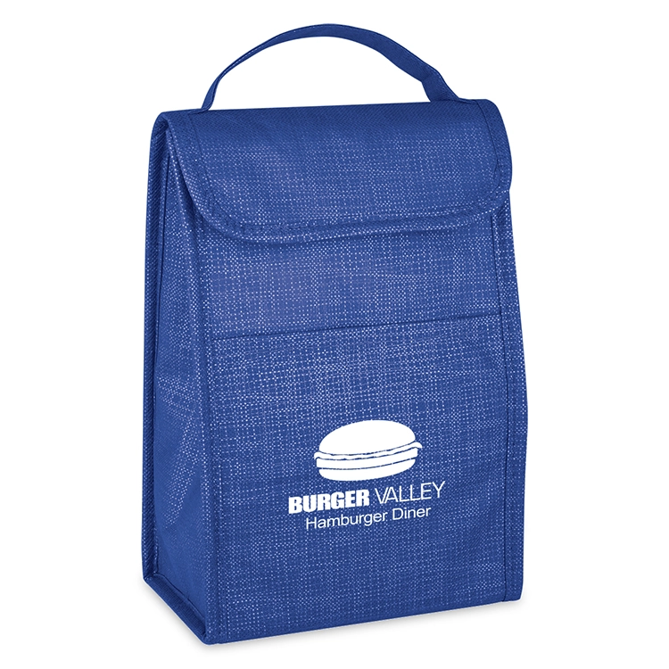 This Crosshatch Hook & Loop Lunch Bag - 7" x 10" is not your ordinary lunch bag. This is made of 80g laminated non-woven, coated water-resistant polypropylene. Comes with a carry handle. Features foil laminated PE foam insulation, hook and loop closure, and front pocket for easy access. Spot clean only and air dry.