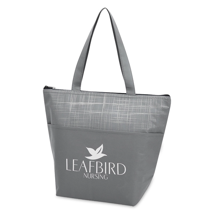 The Crosshatch Non-Woven Cooler with Foil Laminate - 14.63" x 11.63" is not your typical cooler. It features 19.50" carrying handles which can also be put in your shoulders. Include zippered main compartment and large front pocket for easy access. Spot clean only and air dry.