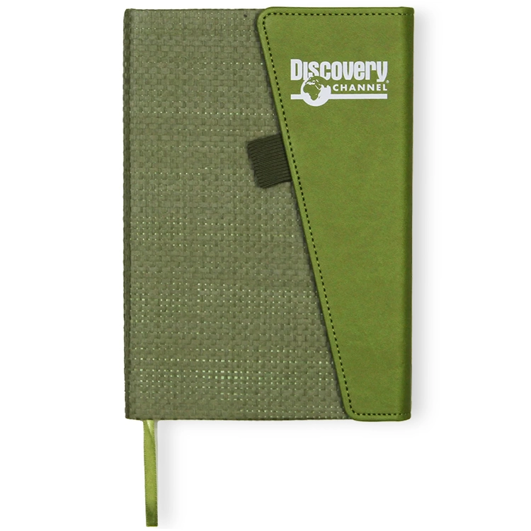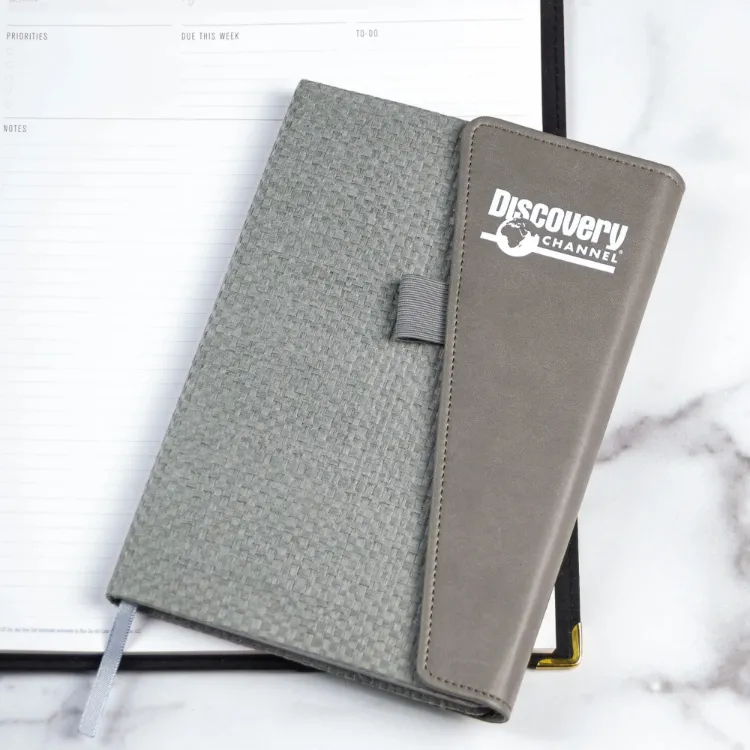 This notebook merges elegance with utility, featuring a woven texture body and a faux leather magnetic closure. With 80 lined pages, it’s ideal for planning or note-taking during executive meetings. A bookmark and front cover pen loop add functional sophistication in a polished design.