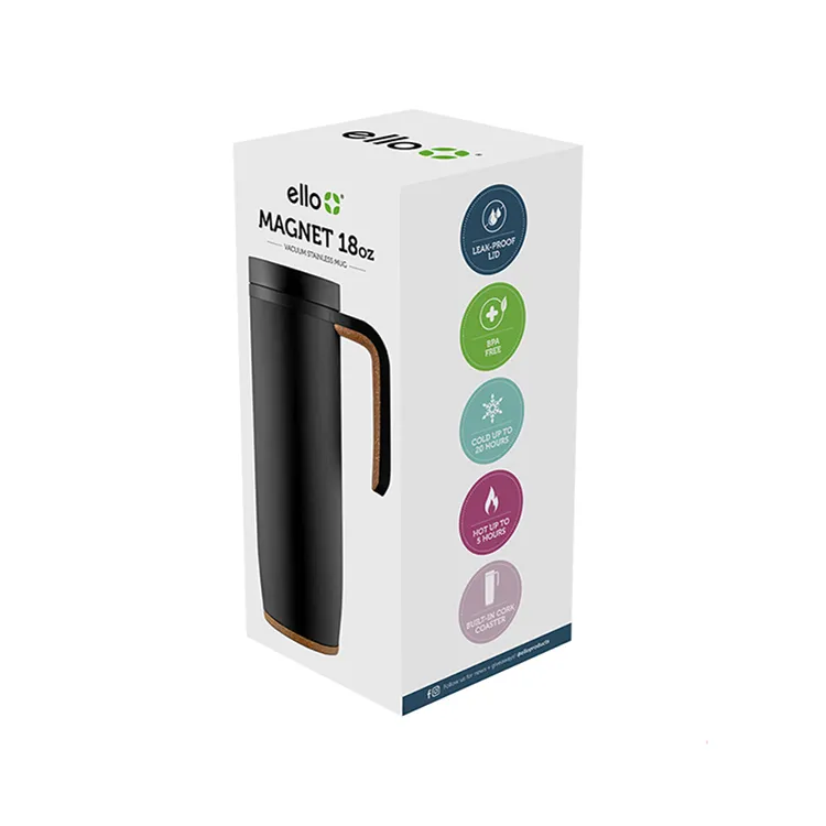 The Ello Magnet Vacuum Stainless Steel Mug - 18 Oz is well constructed from stainless steel and vacuum sealed to keep drinks hot for up to 5 hours and cold for 20 hours, all without condensation beading on the outside. It is free of BPA, phthalates, PVC, cadmium and also meets the drinkware FDA requirements, making it safe for all ages to use. The bottom cork accent functions as a built-in coaster, so no need to worry about furniture scuffing when you place the bottle down. It comes beautifully packaged, making it a great addition to any gift basket, or re-sell item in a souvenir shop. Handwashing recommended for the bottle, but the lid can be tossed in the dishwasher.