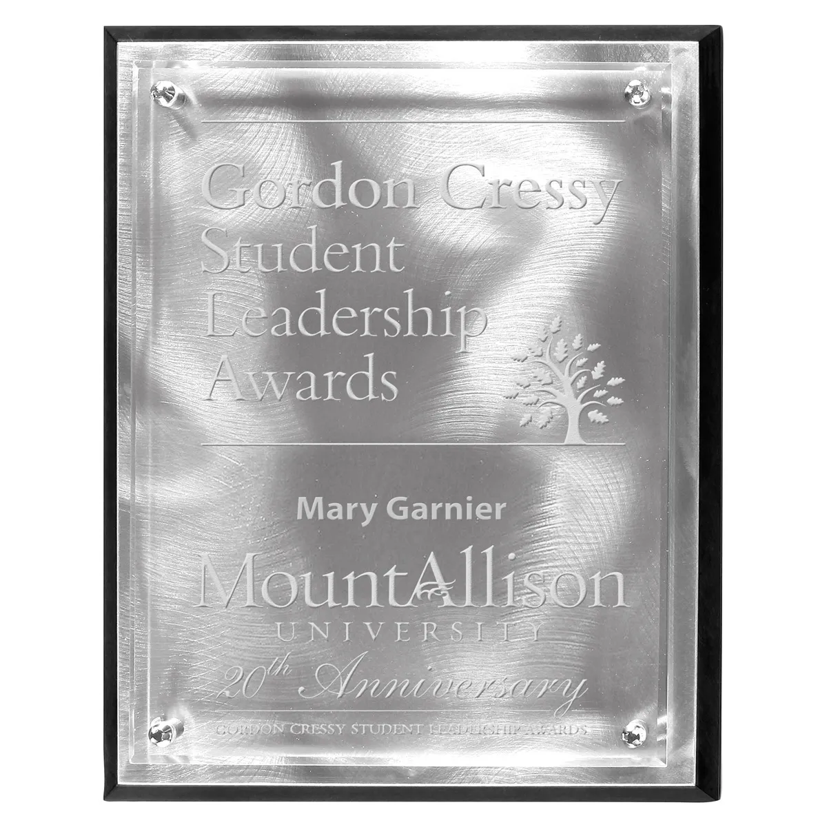 The Extra Large Plaque and Swirled Aluminum - 9" x 12" features decorative swirled aluminum mounted on beveled black acrylic. They have an elevated clear acrylic imprint panel which is held in place with decorative chrome hardware. Choose a laser engraved, 4-color process imprint on a clear acrylic panel.