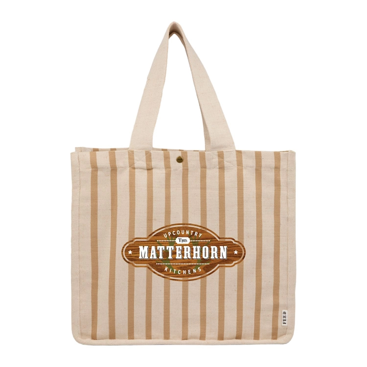 Constructed from an 11 oz blend of 50% cotton and 50% jute, this tote bag pairs structured natural materials with functional everyday storage. The open main compartment includes a brass snap closure to help keep contents contained, while 9" drop handles allow comfortable shoulder or hand carry. A striped exterior adds visual texture, and the interior features the printed FEED giveback message. Each purchase helps provide school meals to children facing food insecurity around the world.