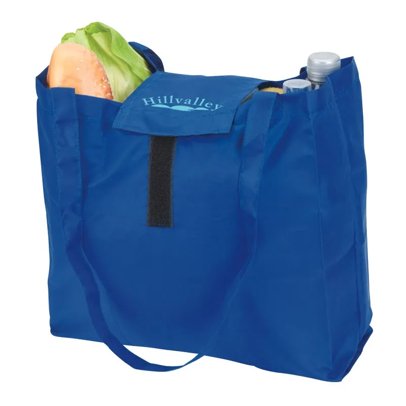 The Foldable Polyester Tote with Hook & Loop Closure - 11 1/2" x 13 1/2" is made from a lightweight 210D polyester material. It features 24" handles, hook and loop closure and it can be folded down to easy carry size. Measures 1 3/4" X 4 5/8" x 1" when folded and includes 50mm carabiner hook to carry while its folded.