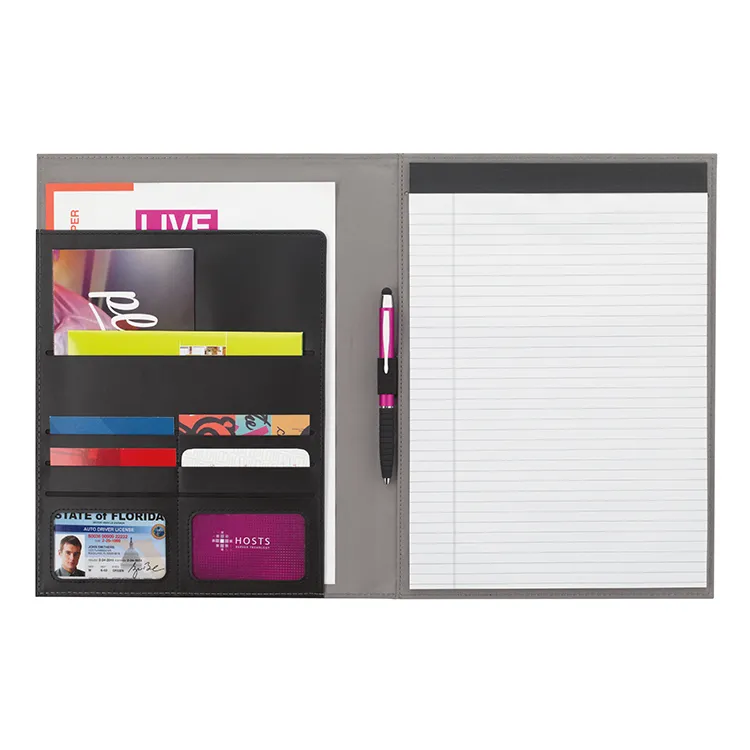 With a heathered gray cover and PU spine, this portfolio balances modern style and functional design. The interior offers practical features like a slip pocket, pen loop, and compartments for cards and ID, plus a full-size writing pad to handle daily notes. An efficient tool for business meetings and event appearances.