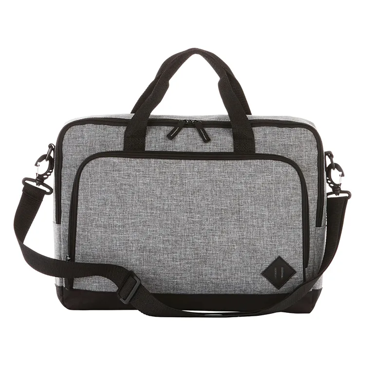 The Graphite Laptop Briefcase has a modern vibe with its classic gray heather shade and black trim. It's top opening is zippered and features a padded laptop compartment. The zippered front pocket has organization panel for your phone, pens and other smaller supplies. Carrying options include a removable adjustable shoulder strap and top grab handles.