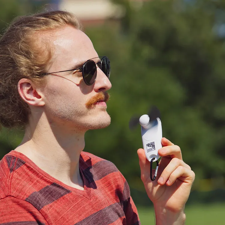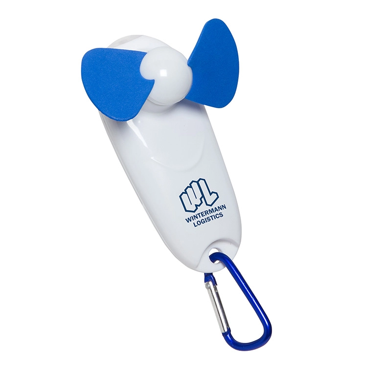 This portable device combines a compact fan with a built-in light, making it a versatile tool for on-the-go comfort and visibility. Soft rubber blades ensure safe use, while the carabiner clip allows for quick attachment to bags or gear. It runs on two AA batteries (included) and is packaged with instructions in a white box.