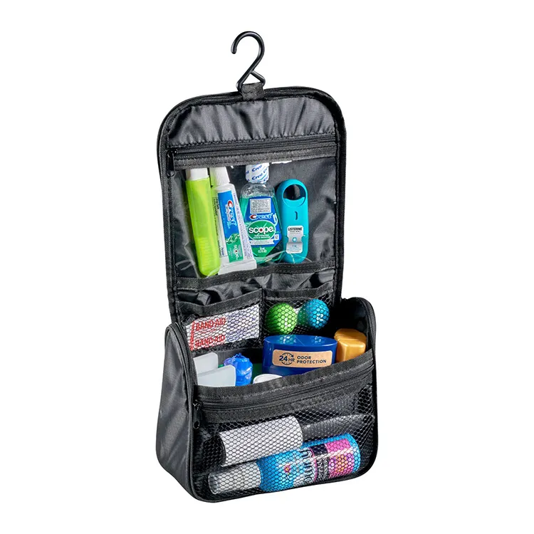 The Hanging Travel Toiletry Bag features a zippered main compartment with interior organization, one side zippered pocket, and a top grab handle. Made from 210D Polyester. This toiletry bag makes the perfect travel accessory