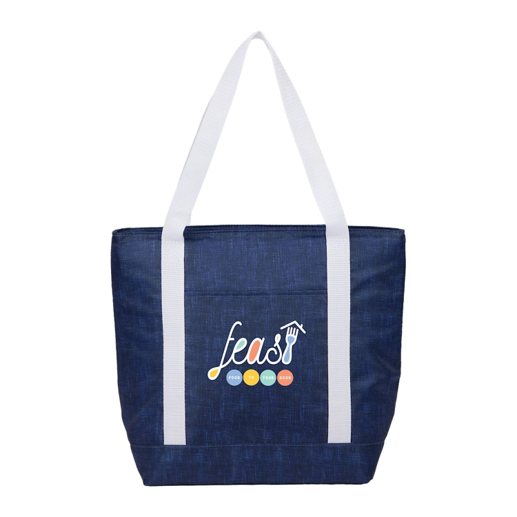 This tote-style cooler delivers lightweight insulated storage with a distinctive patterned design. The tall main compartment holds up to 16 cans and features a gray PEVA lining that helps maintain cooler temperatures while allowing easy cleaning. Its tote structure provides convenient access for beverages, snacks, or packed meals during workdays or day trips. The exterior is constructed from 100% recycled 210D polyester, combining reduced material impact with dependable everyday use.