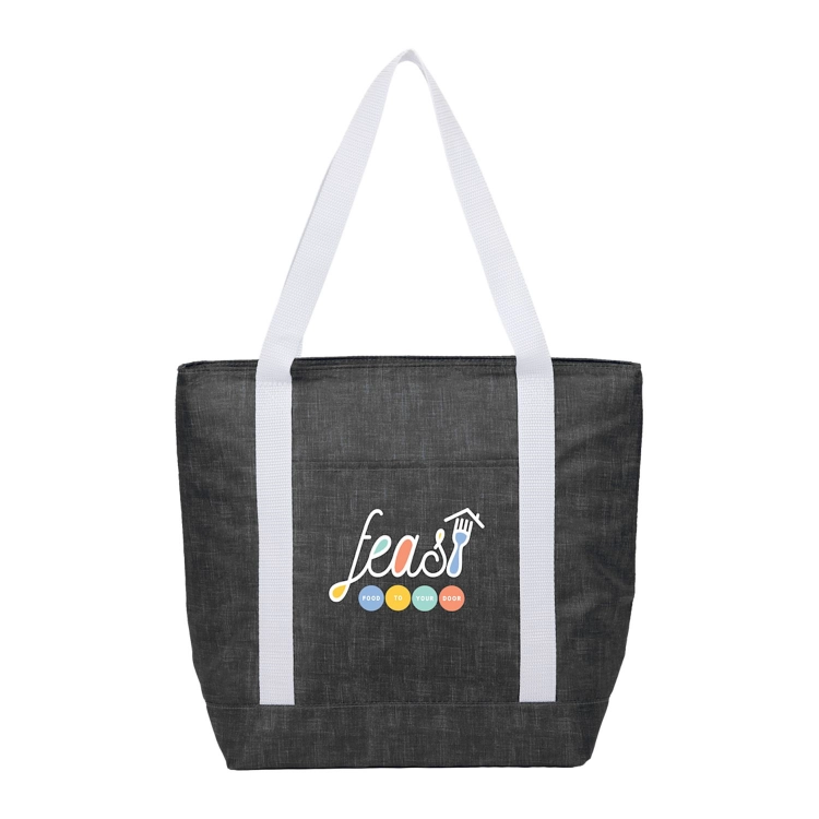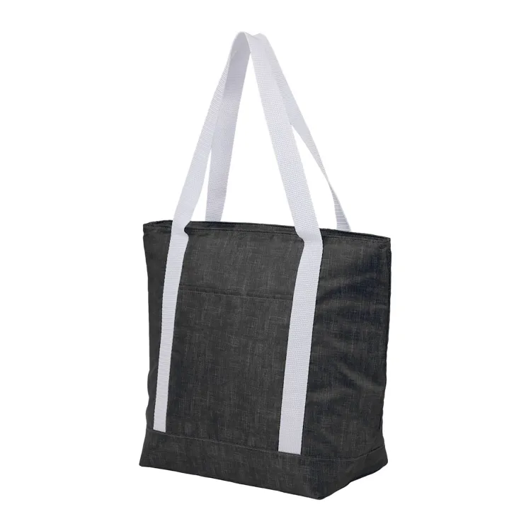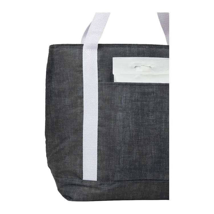 This tote-style cooler delivers lightweight insulated storage with a distinctive patterned design. The tall main compartment holds up to 16 cans and features a gray PEVA lining that helps maintain cooler temperatures while allowing easy cleaning. Its tote structure provides convenient access for beverages, snacks, or packed meals during workdays or day trips. The exterior is constructed from 100% recycled 210D polyester, combining reduced material impact with dependable everyday use.