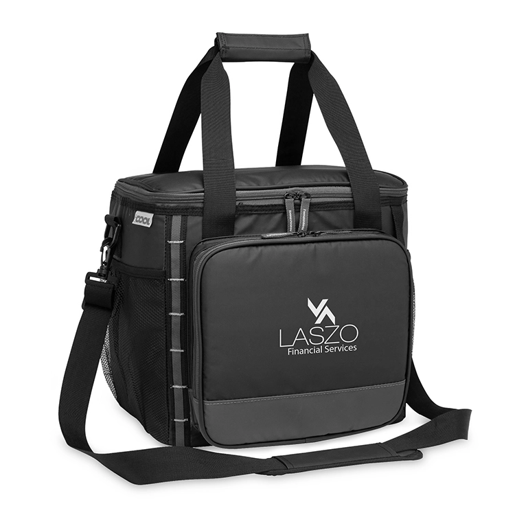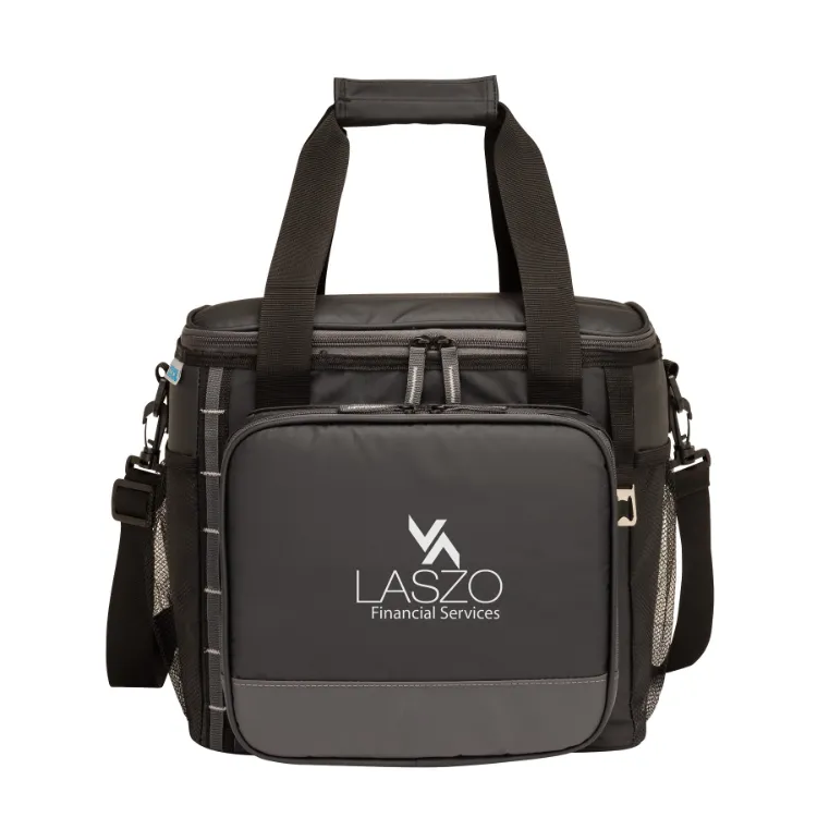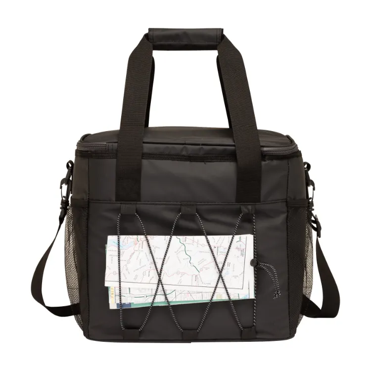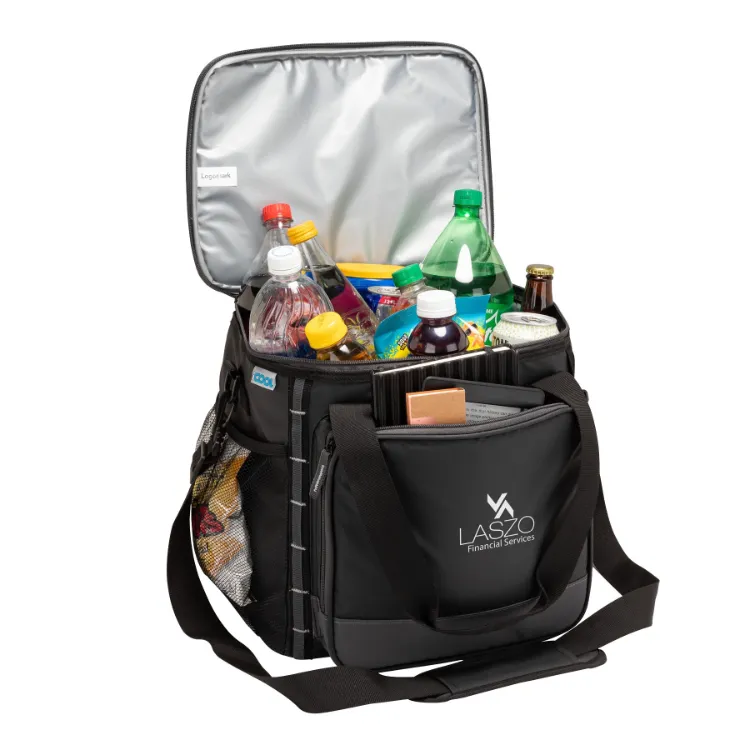The iCOOL Denver Cooler Bag - 24 Can is the ultimate companion for your outdoor adventures, offering a spacious 24-can capacity and a rugged design. With a water and tear-resistant tarpaulin exterior, this cooler bag is built to withstand the elements. The large main compartment features a 3/4 zip-around opening for easy access, while the heat-sealed PEVA lining and thick foam insulation keep your drinks and food perfectly chilled. Additional features include a zippered front pocket, two side mesh pockets, carry handles, and a removable 1.5" x 50" shoulder strap for versatile carrying options. The top side adjustable elastic tie-down cord, built-in bottle opener, and daisy chain add extra convenience. Plus, it's FDA compliant, and a portion of the proceeds supports Shelter to Soldier™.