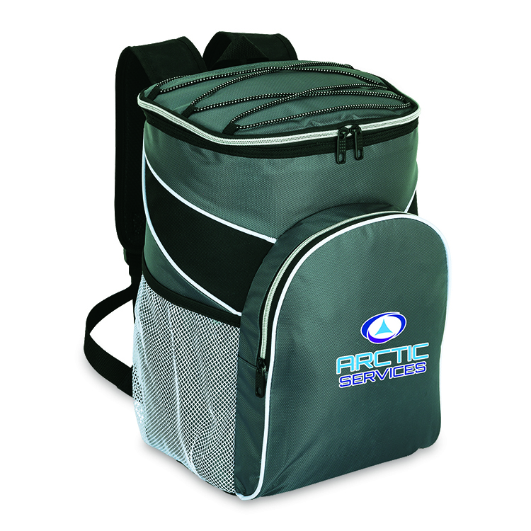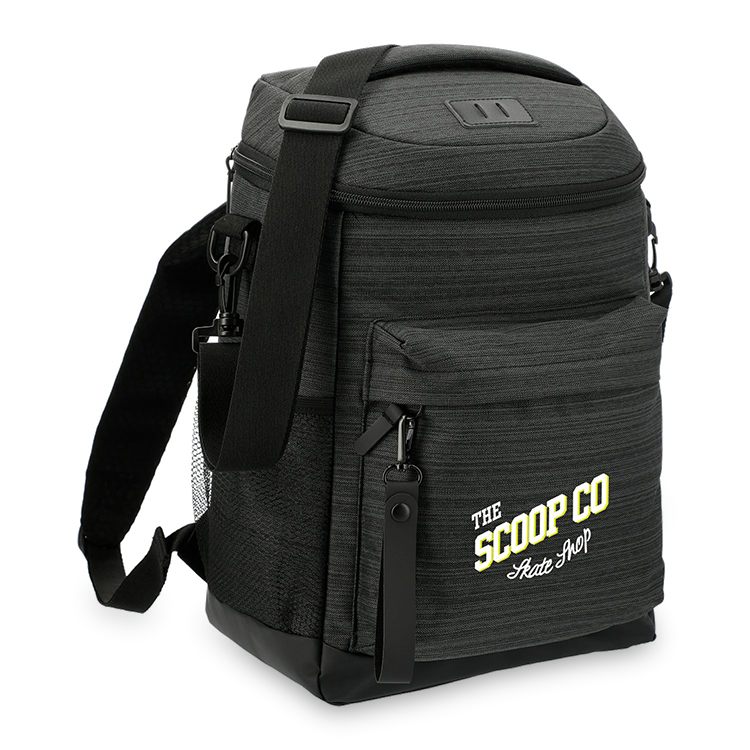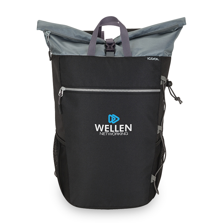 The Insulated Polyester Laptop Backpack gives you the best of both words - a top section that includes a dedicated padded 15" laptop compartment, as well as a zippered PEVA lined bottom cooler compartment. Perfect for heading back to school or the office, all your daily essentials can fit in the roll top compartment, while your bento box and drink for lunch can stay cool in the bottom. The front slash pocket is perfect for keeping your mask or keys nearby. This backpack features custom lining, a premium vinyl lash-tab, and adjustable padded shoulder straps.