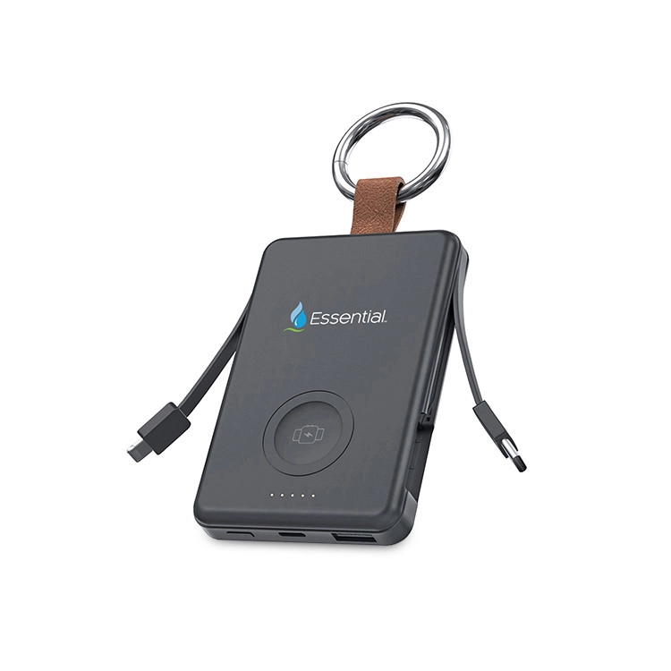This compact 5,000 mAh charger offers unmatched versatility with support for both Apple and Samsung smartwatches. Built-in Type-C and Lightning cables, plus USB and Type-C ports, ensure seamless charging across your devices. A leather loop key ring adds portability and secure carry, ideal for travel or everyday use.