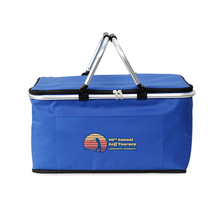 The Jamboree Insulated Hard Frame Picnic Basket is a must-have for any outdoor adventure, boasting a generous 36-can capacity and constructed from durable 600D polyester with an insulated foam interior to keep your refreshments perfectly chilled. Its 1/2" diameter metal frame around the top ensures stability, while the padded dual 6" hard frame metal handles are hinged and fold open for easy access. Featuring a dual-zippered top lid closure and accented with stylish black braided trim around the edges, this picnic basket also includes a large 11-1/2" x 6-1/2" front pocket for extra storage. Plus, it collapses flat for effortless travel and storage, making it the ideal companion for all your picnics and gatherings.