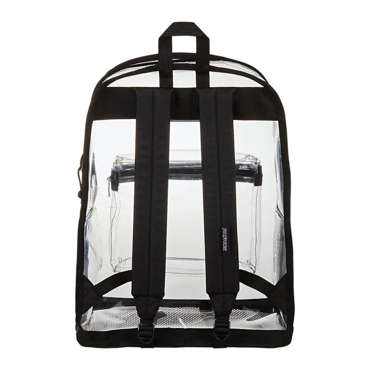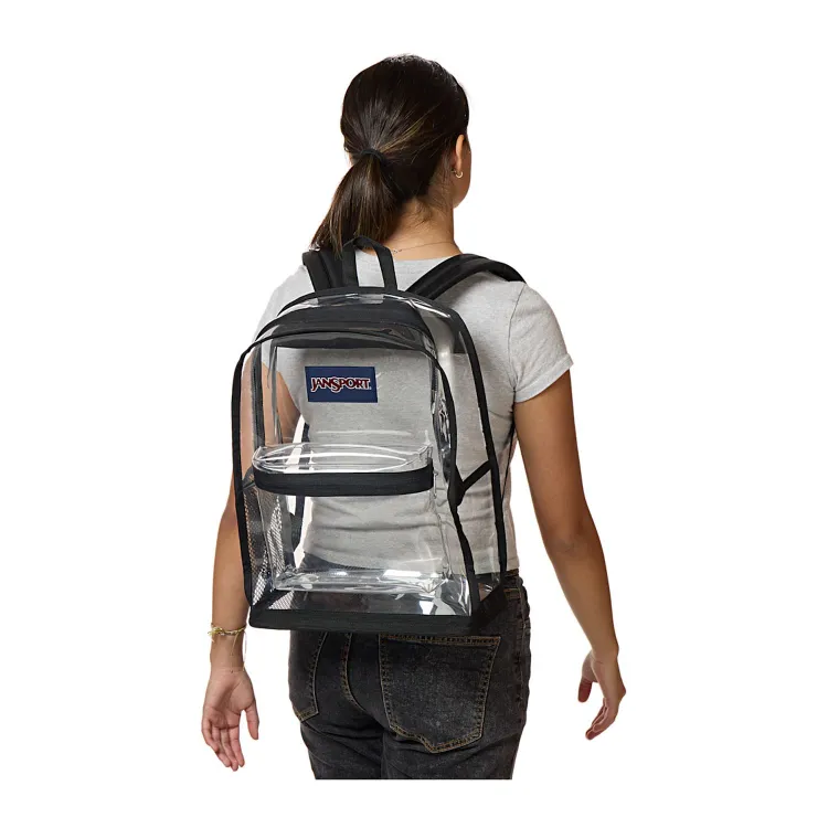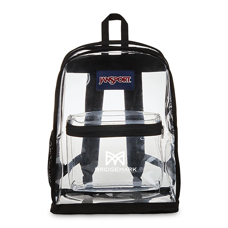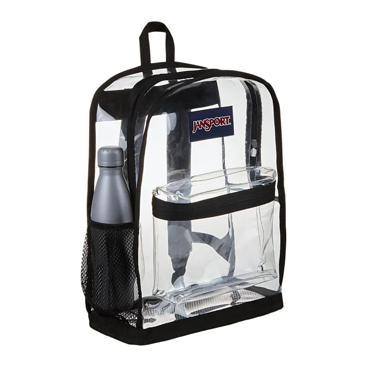 This clear backpack provides organized storage while allowing quick visibility of contents for security-conscious environments. The spacious main compartment accommodates larger items, while a front zippered pocket keeps smaller essentials accessible. A side pocket holds a water bottle, and the abrasion-resistant mesh bottom panel adds structure to the bag’s base. Adjustable padded shoulder straps and a reinforced top handle support comfortable carrying throughout school, events, or workplace use.