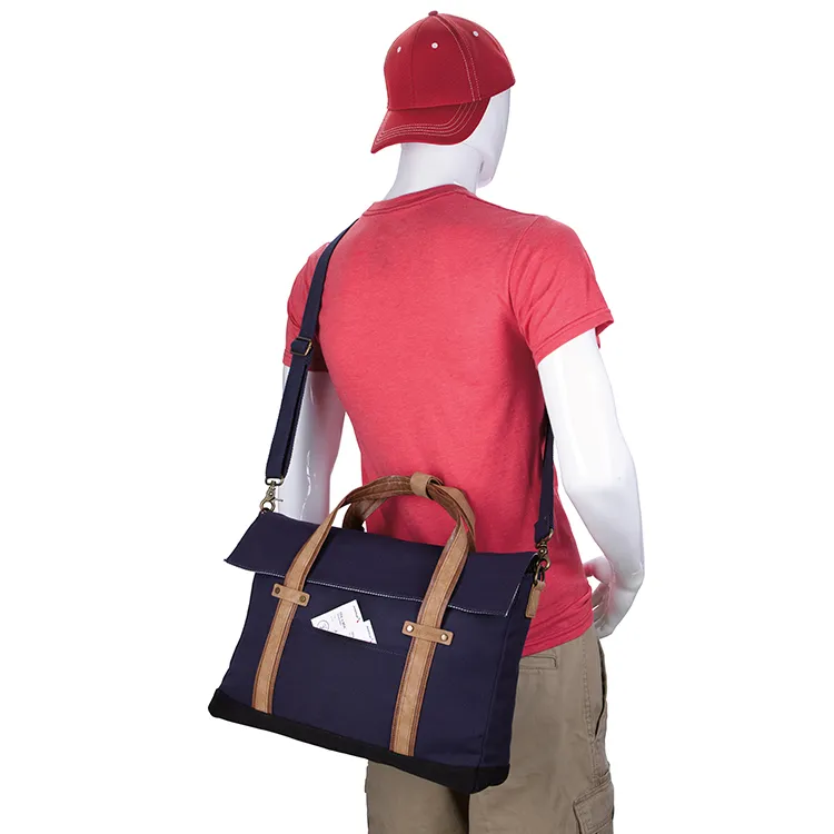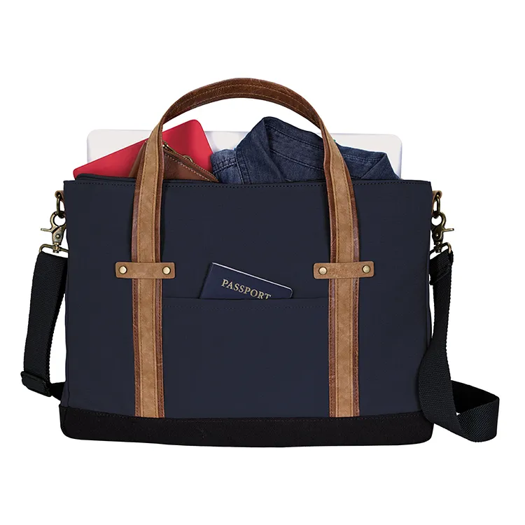 - Brown leatherette grab handles and removable adjustable webbed messenger strap