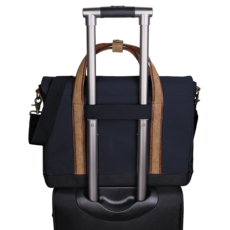 The KAPSTON San Marco Laptop Messenger Bag - 15" is a sophisticated messenger bag made with 16 oz cotton canvas. The main zippered comparment with padded laptop compartment that fits most laptops up to 15". It comes wtih a front slip pocket for small miscellaneous items and an adjustable, removeable shoulder strap. It features unique striped interior lining. Its leatherette and suede carry handles are not only functional but give it an air of sophistication.