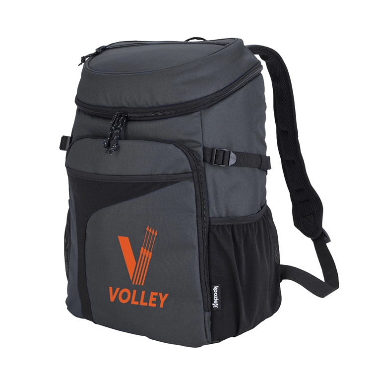 The Koozie Boho rPET Cooler Backpack - 24 Can is the ultimate eco-friendly solution for keeping your refreshments cool, boasting a 24-can capacity and made from 30% post-consumer recycled PET—equivalent to 13 plastic water bottles. This versatile cooler features a large zippered main compartment with a heat-sealed PEVA liner and a water-resistant TPU bottom, ensuring no leaks. It also includes an upper zippered compartment, front zippered pockets, and two side pockets with compression straps for ample storage options. The inner mesh zippered pocket under the flap offers additional organization, while the padded straps with attachment loops, a bottle opener, and a stretchy mobile pocket ensure comfort and convenience. Perfect for picnics and outdoor adventures, this cooler backpack combines sustainability with practicality.