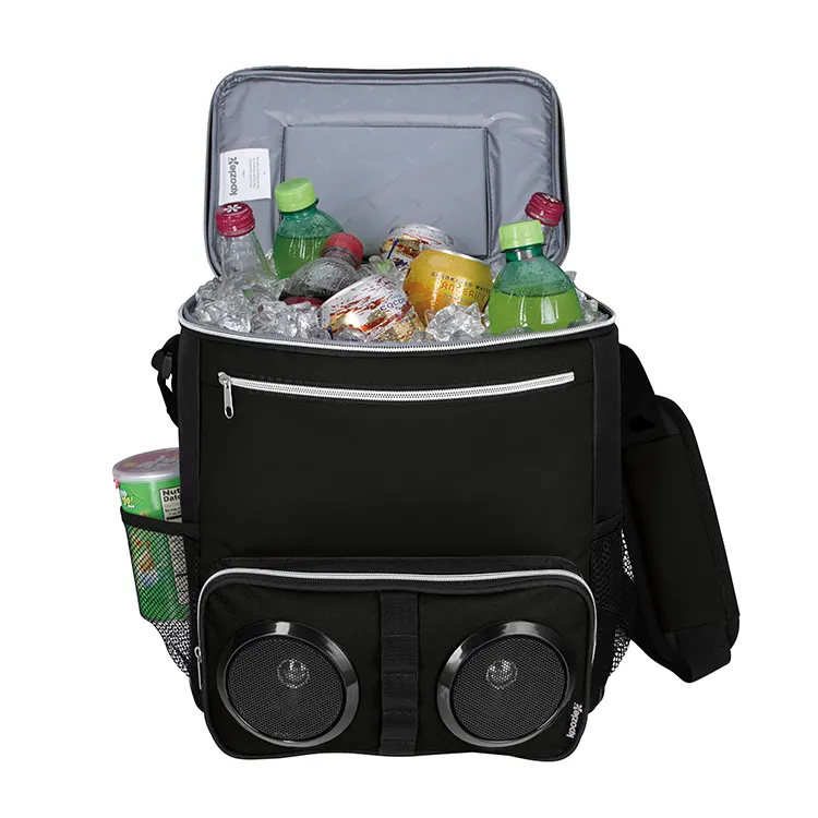 The Koozie Chillin' Bluetooth Speaker Cooler - 30 Can is the ultimate accessory for beach days or backyard BBQs, combining chilling and entertainment effortlessly. With a 30-can capacity and made from durable 600D polyester, it features a main zippered compartment with a top hook-and-loop opening for easy access. The front zippered pocket and two side mesh pockets provide extra storage, while two Bluetooth® speakers mounted in the front pocket let you pair with your device and enjoy your favorite tunes. The cooler also includes an attached bottle opener, an adjustable padded shoulder strap, and a heat-sealed PEVA liner to keep everything cool with ice packs.