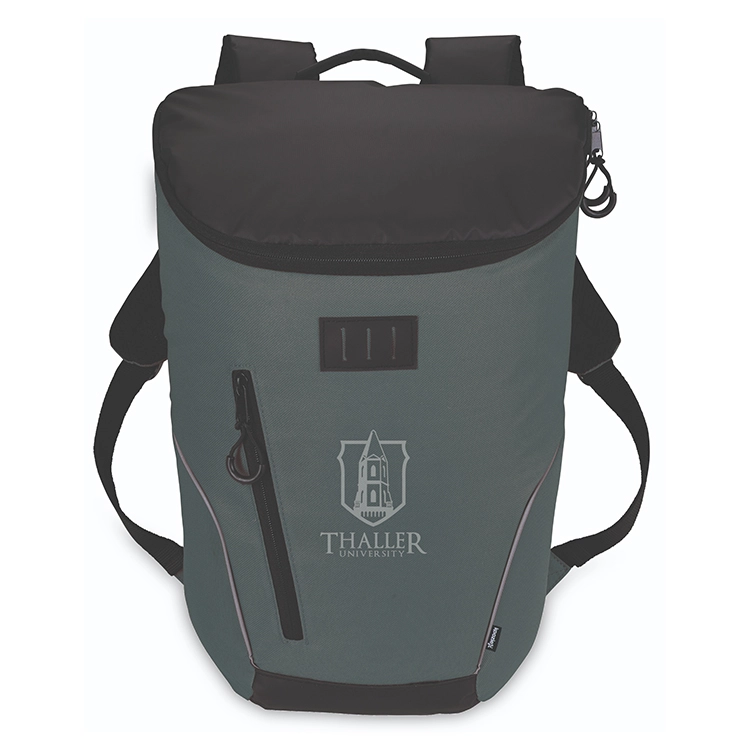 The Koozie Rogue Cooler Backpack - 16 Can is the perfect blend of style and functionality for carrying your party food and drinks in style. With a 16-can capacity, this cooler is made from durable 600D polyester and features a heat-sealed PEVA liner to keep your items cool. The large zippered main compartment and front zippered pocket provide ample storage, while the easy-to-clean tarpaulin bottom adds durability. Comfort is ensured with padded adjustable shoulder straps, and the leatherette lash tab with reflective piping adds a touch of style. Whether for picnics, outdoor adventures, or parties, the Koozie Rogue Cooler Backpack has you covered.