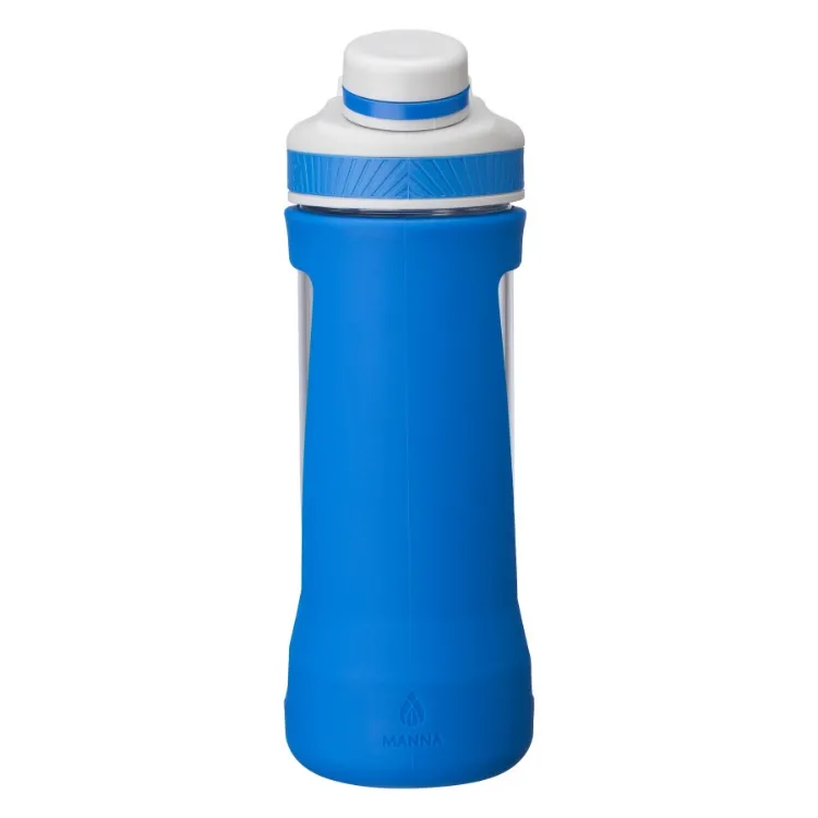 The Manna Ranger Glass Bottle - 20 oz from Manna™ is a sport and outdoor lover's dream come true. Its leakproof twist off lid with textured double injection grip and hinged carry loop allow you to carry this bottle anywhere. It has a colored silicone sleeve that matches the lid and loop. The lid's design features a small drinking spout with tethered lid, and a larger screw-tight opening for adding ice and easy cleaning. BPA free.