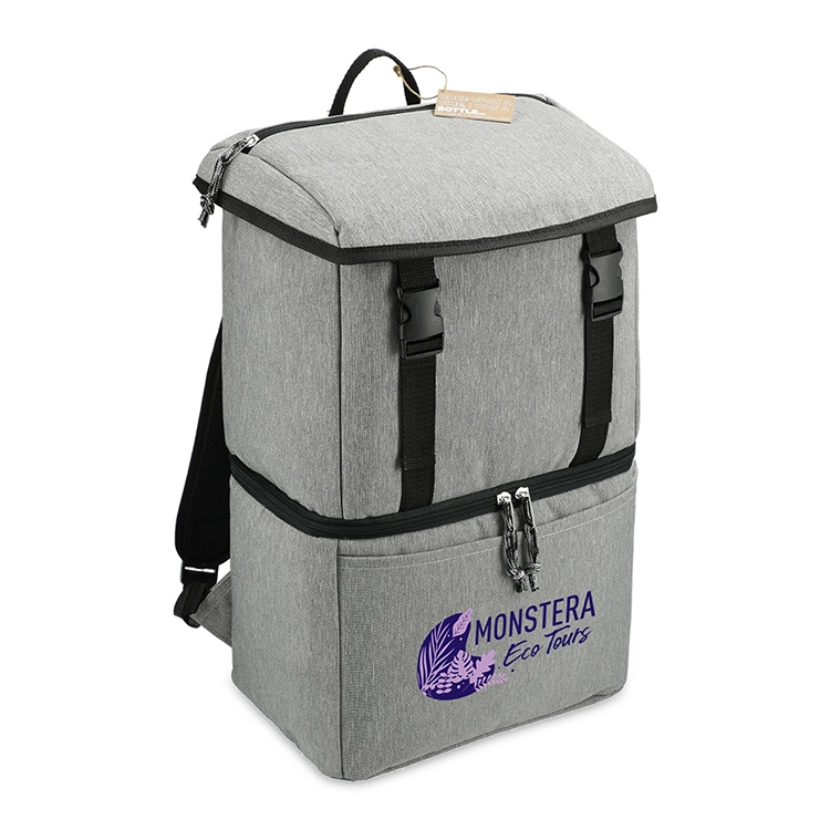 The Merchant & Craft Revive Recycled Backpack Cooler - 11" x 16" is the perfect blend of sustainability and convenience for your outdoor adventures. Made from recycled 600D polyester, it features a roomy top compartment with a cinch closure for dry items and an insulated zippered bottom compartment with a waterproof grey PEVA lining for food and drinks. The top flap with a side release buckle closure and a zippered top stash pocket add extra security and storage. With padded shoulder straps and a sturdy grab handle, carrying is a breeze. Plus, one percent of sales is donated to the 1% For The Planet non-profit organization, making this backpack cooler an eco-friendly choice for picnics, parties, and more.