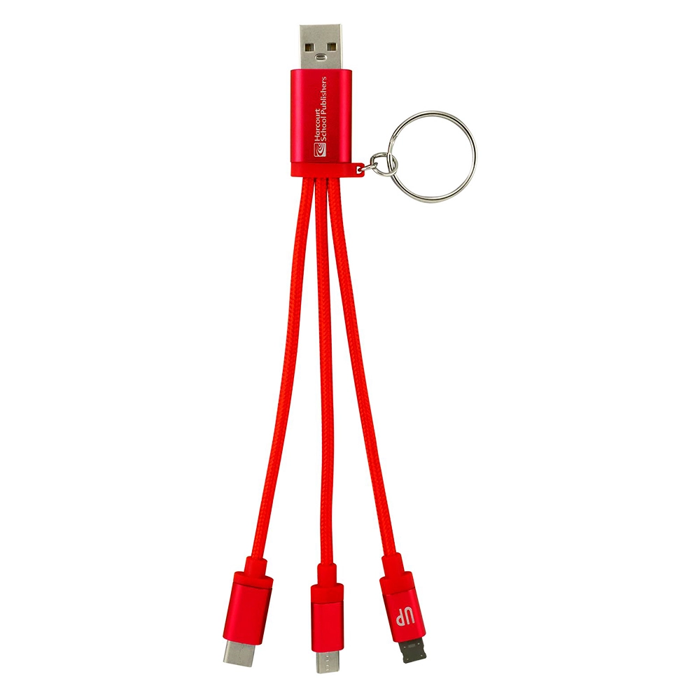 This Metallic 3-in-1 Braided Charging Cable with Keychain features an Apple® 8-pin devices compatibility, micro USB, and type C USB. Makes it easy to charge any device when needed and it can charge multiple devices at once. Perfect for home and office or travel. Laser engraving etches white. Available in 6 different colors.