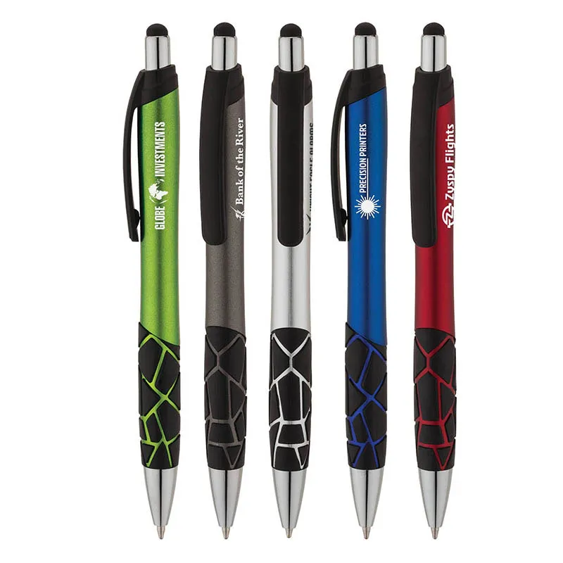 The plunge-action ballpoint features a metallic barrel and textured GEO pattern rubber grip. On top of the plunger sits a handy stylus tip for all of your touch screen needs.