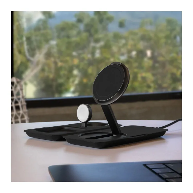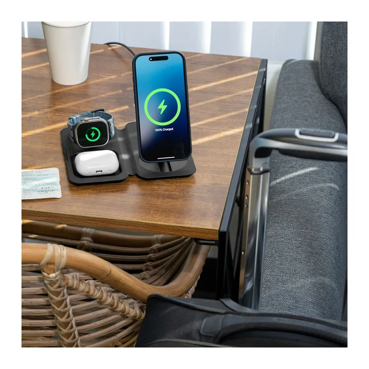 This compact 3-in-1 charger powers your iPhone, Apple Watch, and AirPods with fast wireless charging up to 15W. It features a foldable hinge for upright or flat positioning and a dedicated Nightstand mode for your watch. Crafted from cruelty-free Aloe Leather and built with REPLAY recycled materials, it supports both your tech and sustainability goals. The included USB-C cable and 36W adapter make it ready to use out of the box.