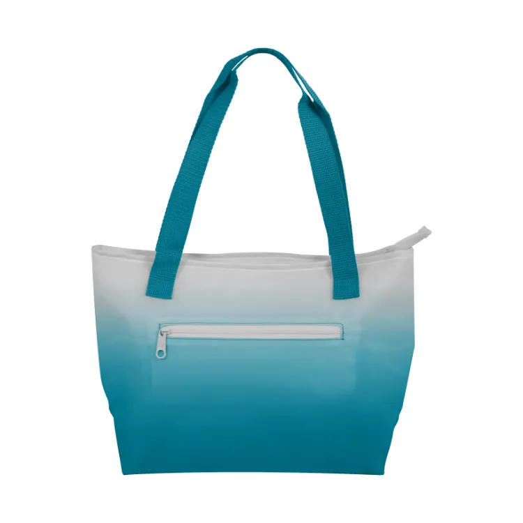 The Ombre Lunch Cooler - 8 Can is a stylish and practical solution for keeping your food and drinks fresh during picnics, outdoor adventures, parties, and more. With an 8-can capacity, this cooler is made from durable 210D polyester and features foil insulation for superior temperature control. The zippered main compartment and front zippered pocket provide ample storage, while the 20" handles ensure easy carrying. Combining fashion and functionality, the Ombre Lunch Cooler is the perfect accessory for any outing.
