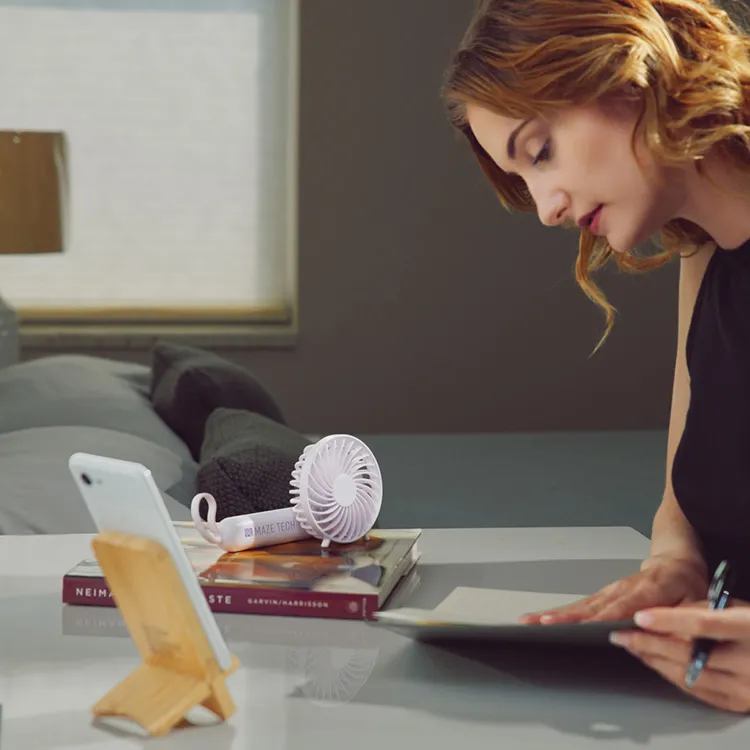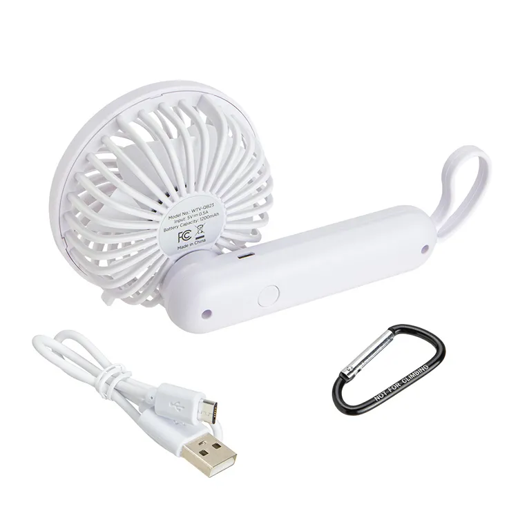 Designed for portability and function, this handheld fan features a brushless motor for quiet performance, three fan speeds, and 180° rotation for desktop use. A carabiner clips to the silicone strap, enabling attachment to bags or gear. With up to 5 hours of runtime and USB charging, it’s packaged in an FSC-certified box with instructions.