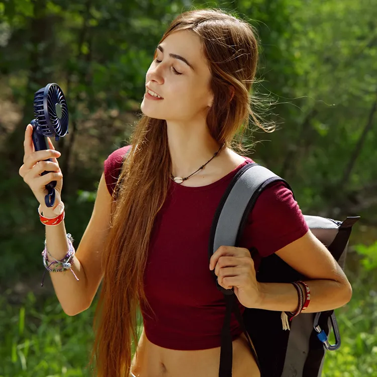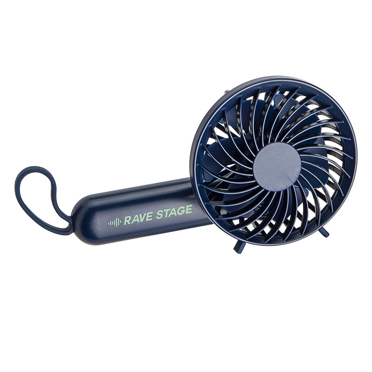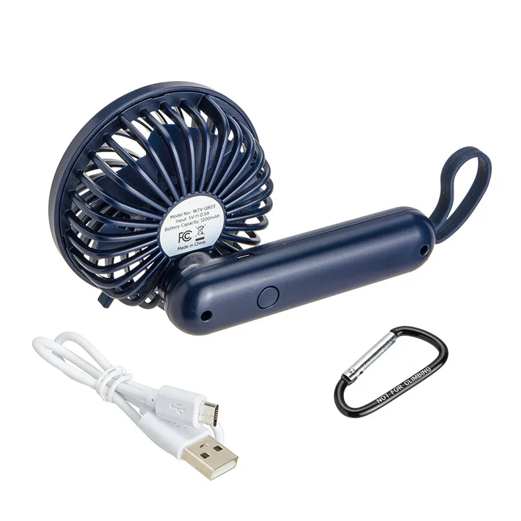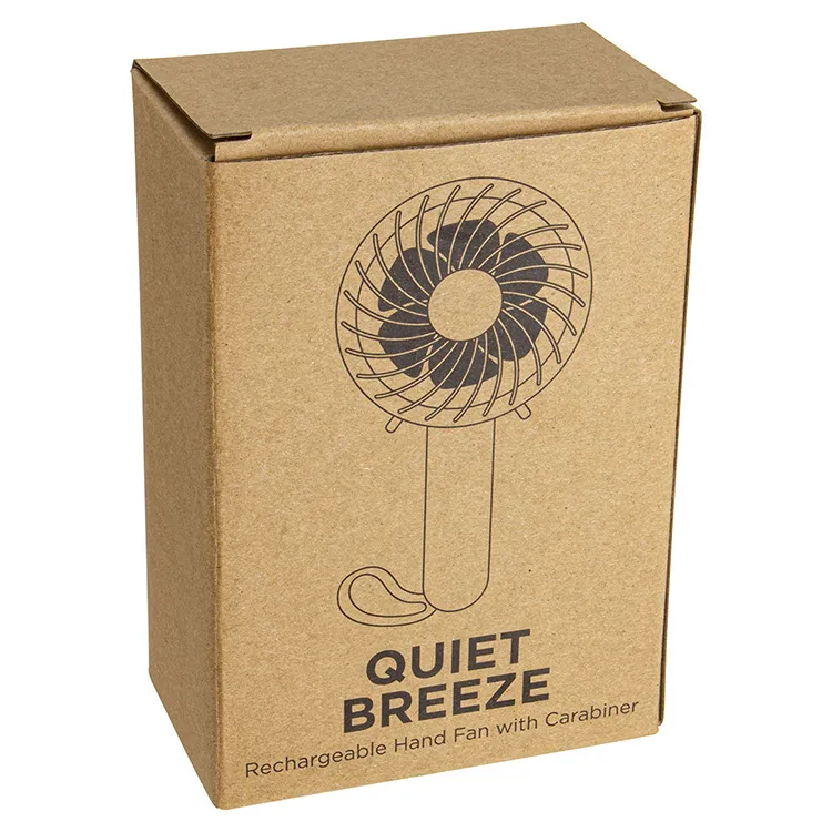 Designed for portability and function, this handheld fan features a brushless motor for quiet performance, three fan speeds, and 180° rotation for desktop use. A carabiner clips to the silicone strap, enabling attachment to bags or gear. With up to 5 hours of runtime and USB charging, it’s packaged in an FSC-certified box with instructions.
