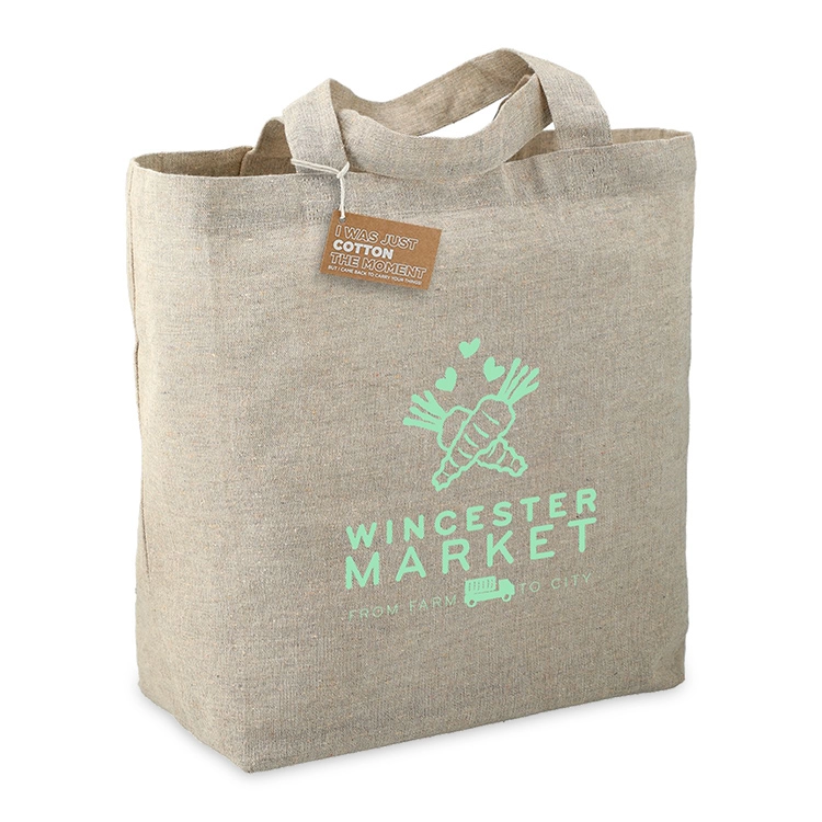 The Recycled 5 oz Cotton Twill Grocery Tote - 13" x 11" will be your number one choice for an everyday bag, may it be for grocery shopping or your vacation on a beach. It promotes sustainability as it was manufactured from pre-consumer waste generated by factories during the fabric cutting process. Composed of approximately 70%-80% recycled cotton and 20%-30% rPET. Comes with a sturdy covered bottom board and an open main compartment for easy access to your things. Through a partnership with 1% For The Planet one percent of sales of this and all EcoSmart products will be donated to nonprofits dedicated to protecting the planet