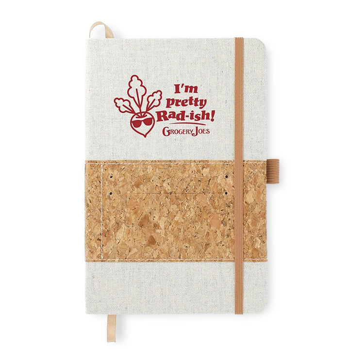 This notebook combines sustainable design with practical features, offering a hard cover made from recycled cotton twill and cork. It contains 80 sheets of FSC® Mix recycled lined paper, an elastic pen loop, a ribbon marker, and an organizational front pocket. A responsible choice for eco-conscious branding and daily documentation.