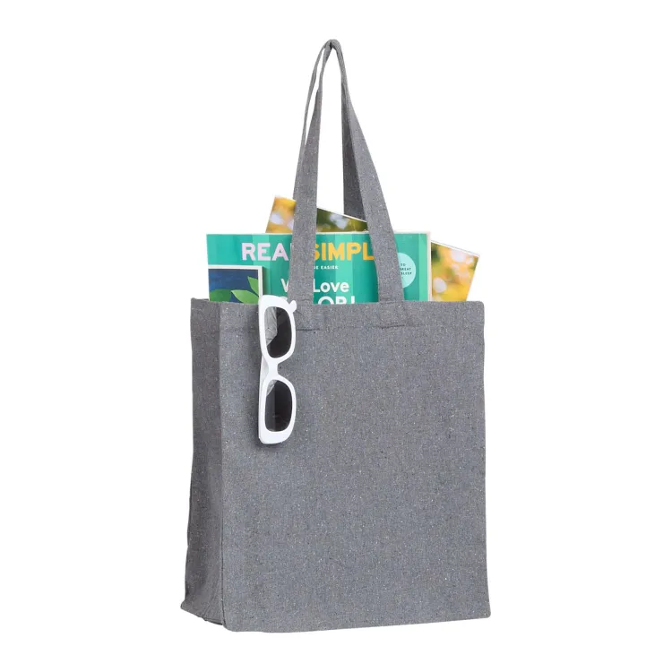 The Recycled Cotton Grocery Tote - 11" x 13" makes an eco-friendly alternative to plastic bags. The material contains recycled 7oz cotton collected from garment cutting waste blended with recycled polyester to produce a strong reusable bag. Through a partnership with 1% For The Planet, one percent of sales of EcoSmart products will be donated to nonprofits dedicated to protecting the planet.