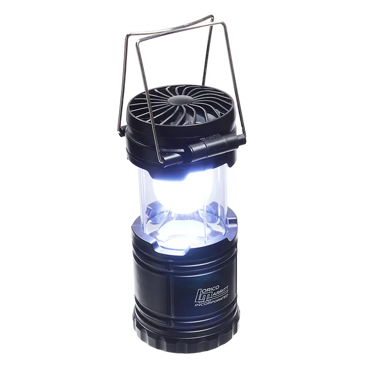 This combination lantern and fan features a built-in adjustable-angle fan and a 100-lumen LED light that activates when the top is pulled open. The foldable handles tuck neatly against the side for easy transport or storage. Powered by three included AA batteries and packed in a white box with instructions, it’s a versatile solution for indoor or outdoor use.